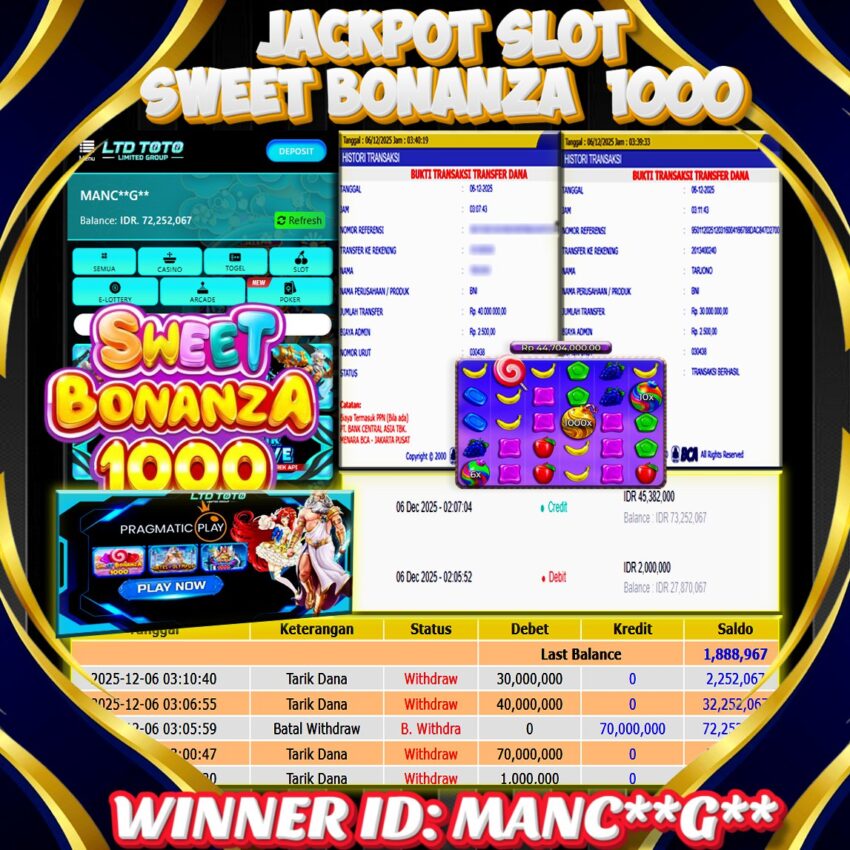LTDTOTO JACKPOT SWEET BONANZA 1000 RP 70.000.000 SABTU 06 DESEMBER 2025